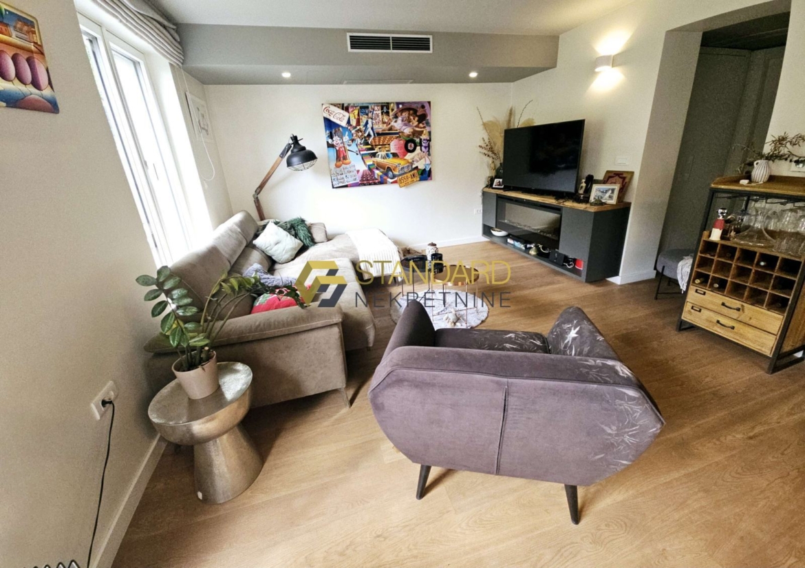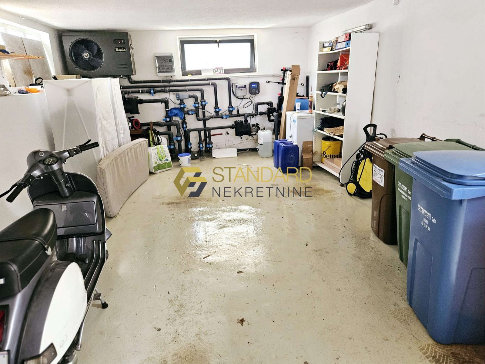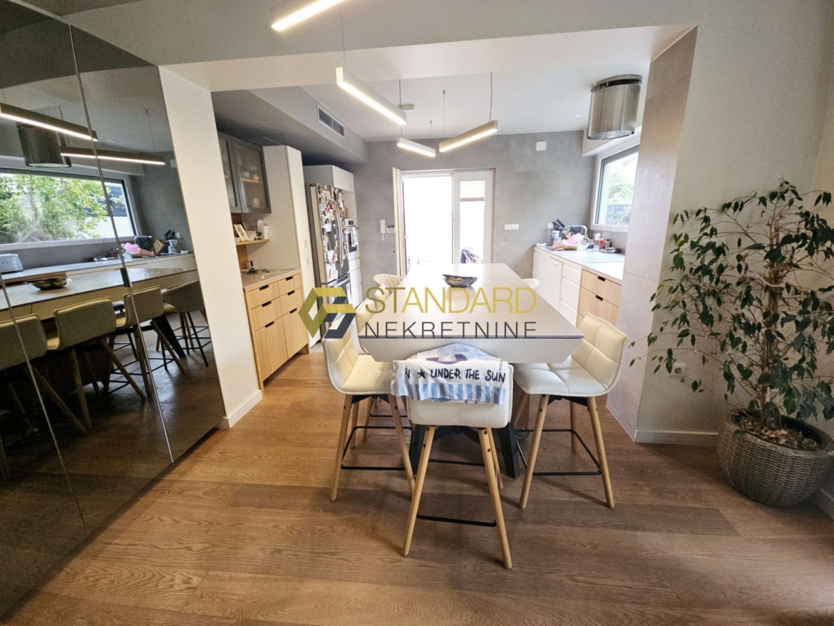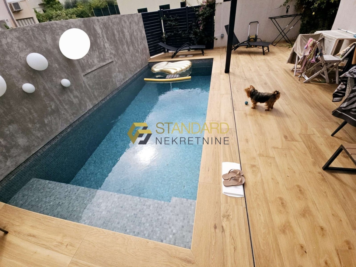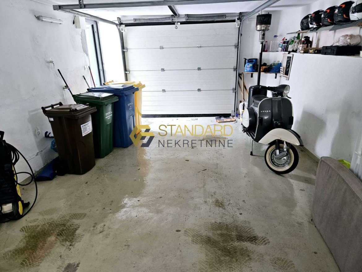 Stan se sastoji se od prostrane kuhinje, blagovaonice, dnevnog boravka (open space koncept), dvije spavaće sobe, hodnika, dvije kupaonice, ostave/praone, terase, privatnog bazena, dvorišta površine 121 m2, te garaže površine 35 m2. Garaža je upisana kao pomoćni objekt, na posebnom zemljišno knjižnom ulošku, odvojena od kuće, te zbog toga postoji mogućnost nadogradnje još jedne etaže, što ovoj nekretnini daje dodatnu vrijednost.